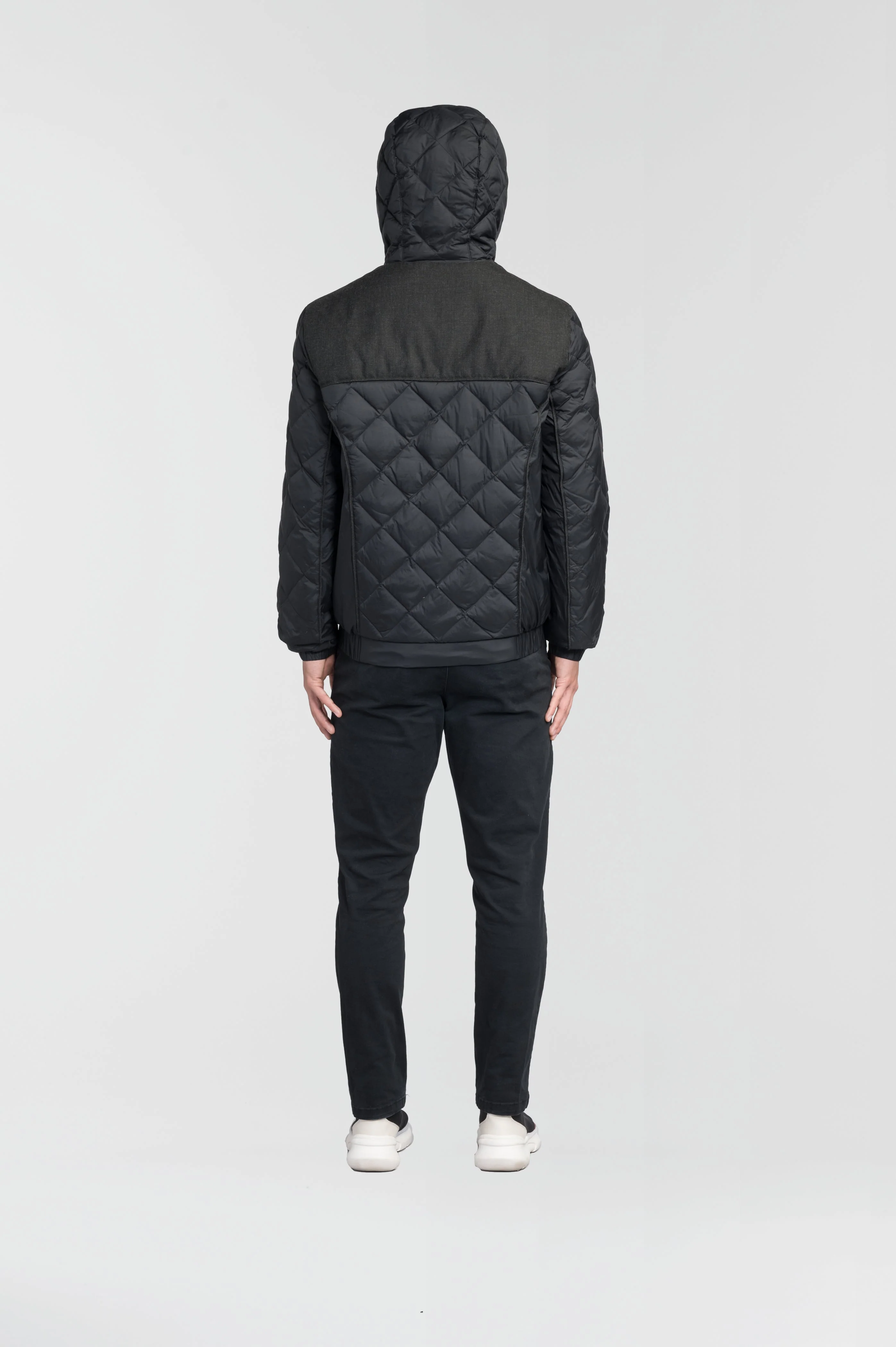 Elroy is cut from our lightweight, weather-resistant DPTM Nylon, with contrasting, wool-blend panels and a premium Canadian white duck down fill to deliver optimal warmth-to-weight insulation. Abrasion resistant and ultra-compact, this transitional weather staple features a seam-sealed construction and an elasticized hem and cuffs to seal out the cold. A high funnel neck and drawstring hood offer added protection against the elements, while tonal piping and a contrasting inner lining provide finishing touches of style.